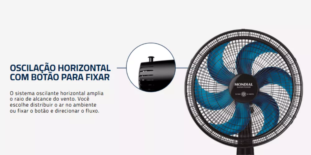 A linha de Ventiladores Super Power possui 30cm de diâmetro e 6 Pás. O design, aliado à potência, promove maior intensidade do vento e garante um ambiente fresco e agradável.