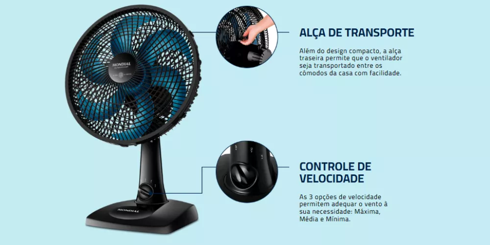 Além do design compacto, a alça traseira permite que o ventilador seja transportado entre os cômodos da casa com facilidade. Com o porta-fio embutido, você armazena o fio elétrico dentro do aparelho após o uso.